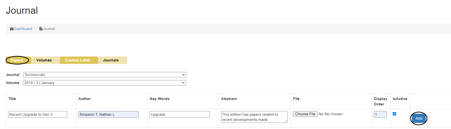 Next step is to add Papers, Click on Papers tab and select Journal and Volume from the drop down menu. Enter relevant details and click on Add button.